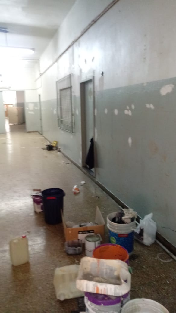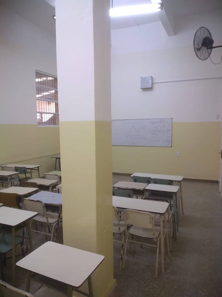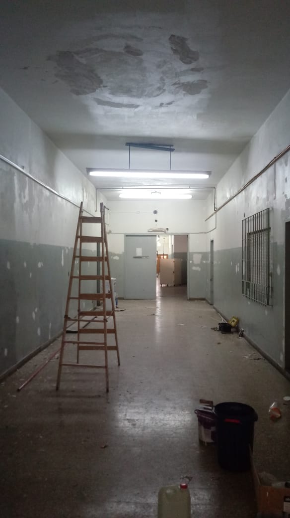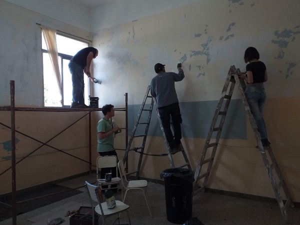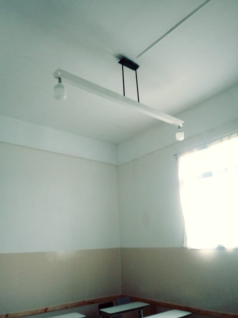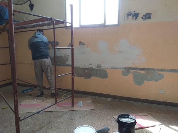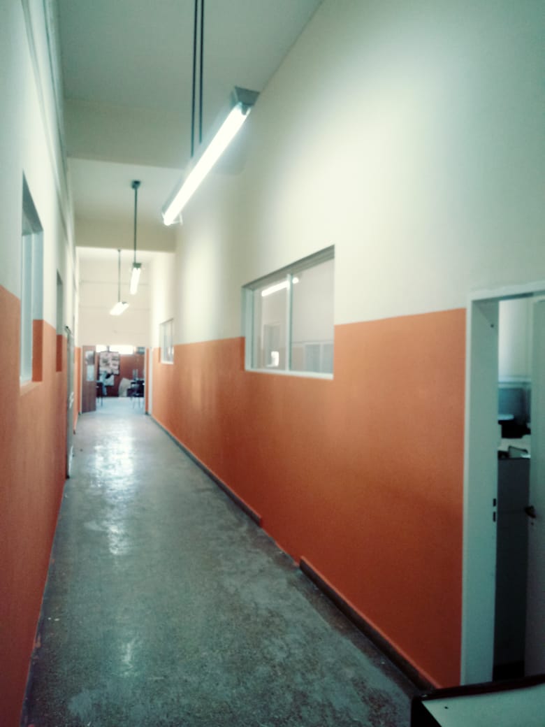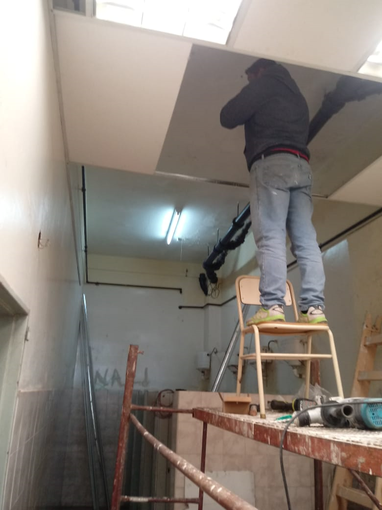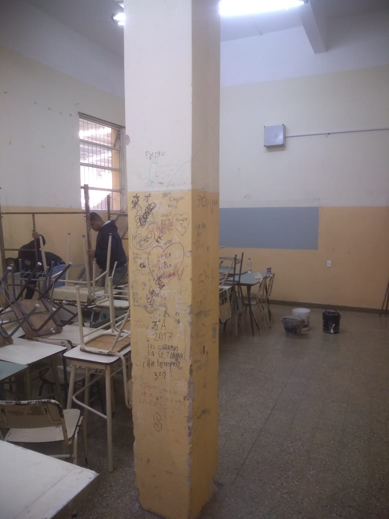 Se comenzó con los trabajos de reparación y pintura en las aulas. Se arreglaron las zonas rotas, pintura de paredes, reemplazo de luminarias rotas y llaves de luz, zócalos y topes de madera para evitar golpear con los bancos. En esta primera etapa, zona de ciclo superior.