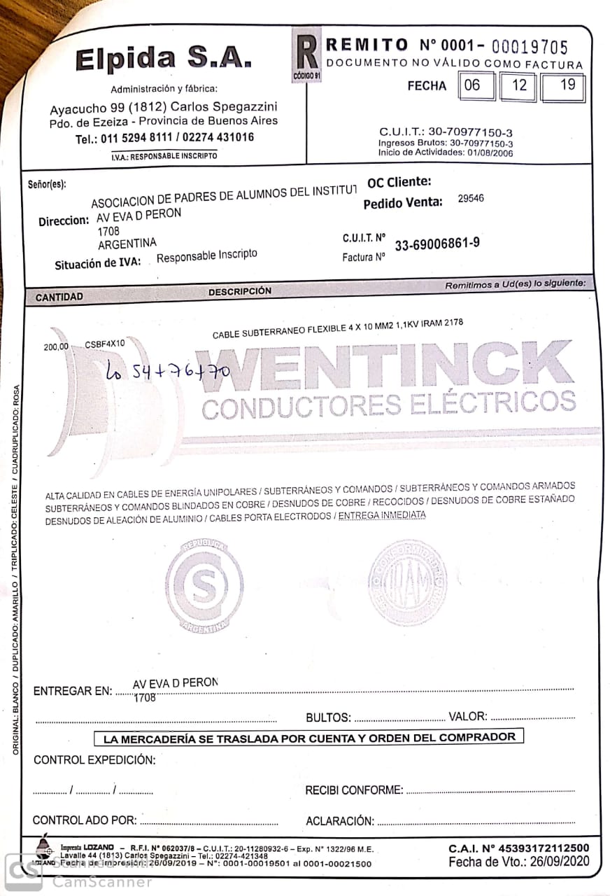 Recibimos la donación de 200mts de cable subterráneo para iluminar el Boeing y otros usos. APAI costeó el flete hasta el Instituto.