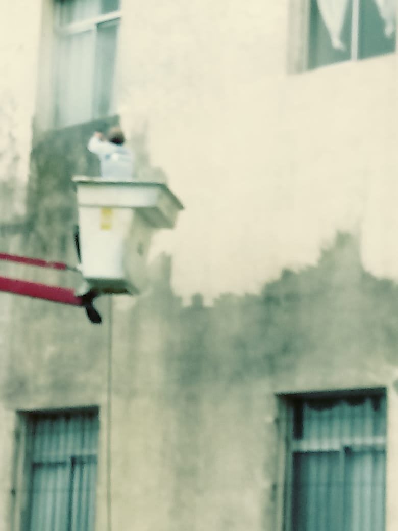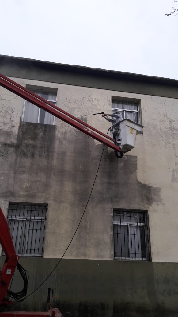 En una primera etapa se realiza la limpieza con hidrolavadora y grúa, para preparar las paredes para pintar.